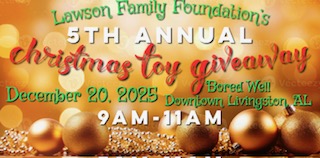 Lawson Family Foundation is gearing up for the fifth year of spreading Holiday Cheer! We are so excited to host our 5th Annual Christmas Toy Giveaway on December 20, 2025, from 9am-11am at the Bored Well in Livingston, Alabama! Our Annual Toy Giveaway is very special to everyone at The Lawson Family Foundation! Not only are we able to serve deserving children and families within our community, but we also get to partner with other amazing organizations within our community during the most wonderful time of the year! This year’s Toy Giveaway will feature hot cocoa bombs, a sugar cookie decorating station and awesome, hourly giveaways!